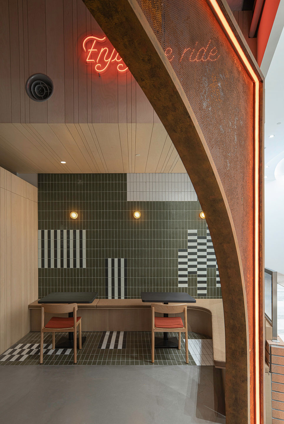 The material palette embraces contrast: rust-colored bridge arches run through industrial metal and textured tile, reflecting the coexistence of urban efficiency and cultural plurality.